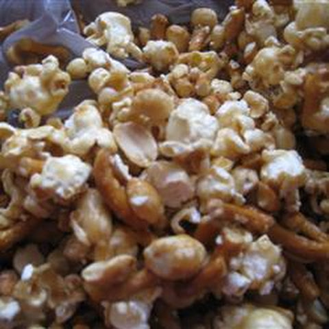 - Place the pretzels, popcorn and peanuts into a large paper bag or, if you have one, a very large bowl. Set aside.